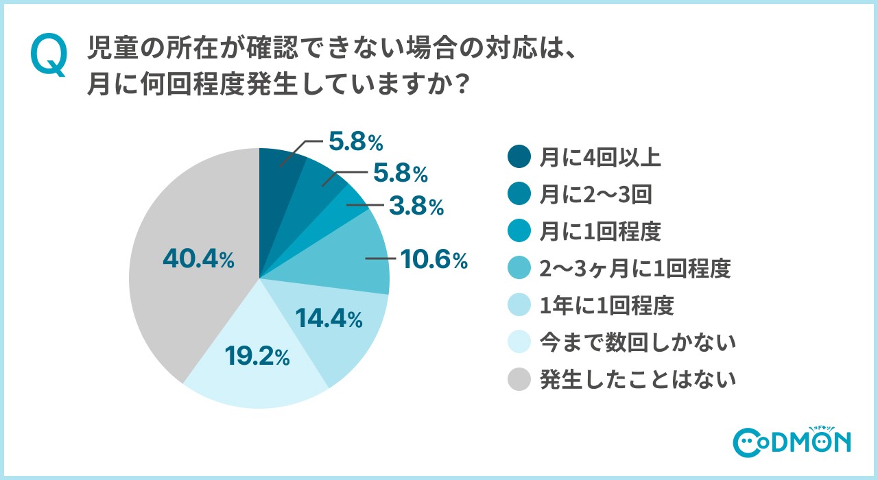 また、児童の所在が一時的に不明な場合の対応の頻度については、「月に4回以上」が5.8%、「月に2~3回程度」が5.8%、「月に1回程度」が3.8%と、月に一度以上発生するという回答が15.4%という結果となりました。