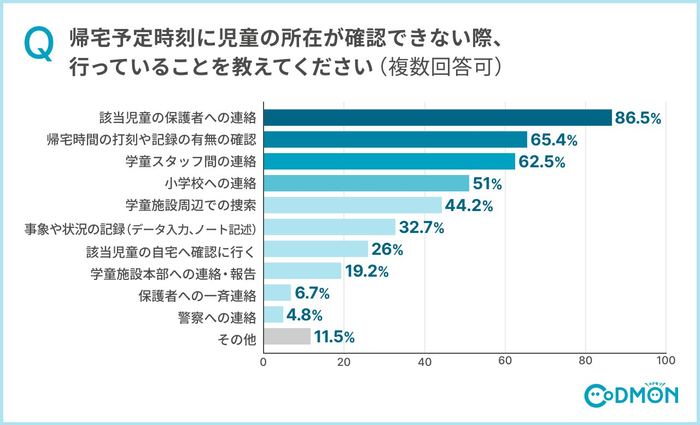 児童の所在が確認できない場合の対応方法は「該当児童の保護者への連絡」が86.5%と最も高く、次いで「帰宅時刻の打刻や記録の有無の確認」が65.4%、「学童スタッフ間の連絡」が62.5%、「小学校への連絡」が51%、「学童施設周辺での捜索」が44.2%という結果でした。