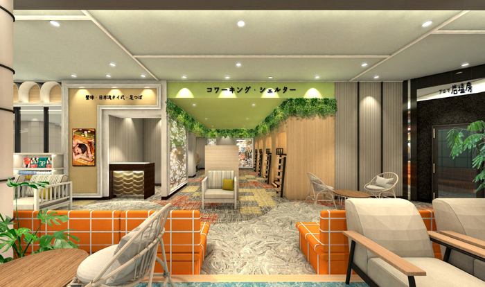 1万冊以上の蔵書を誇る書籍、コミック、雑誌が楽しめるエリアや、半個室型2段BOX「おこもりキャビン」で贅沢な時間をお過ごしいただけます。さらに、Free Wi-Fiとコンセント完備の「コワーキングスペース」エリアが新設され、7種類の岩盤浴で温活したり、ワークや読書、デートなど、多彩なシーンをお楽しみいただける場所が誕生します。