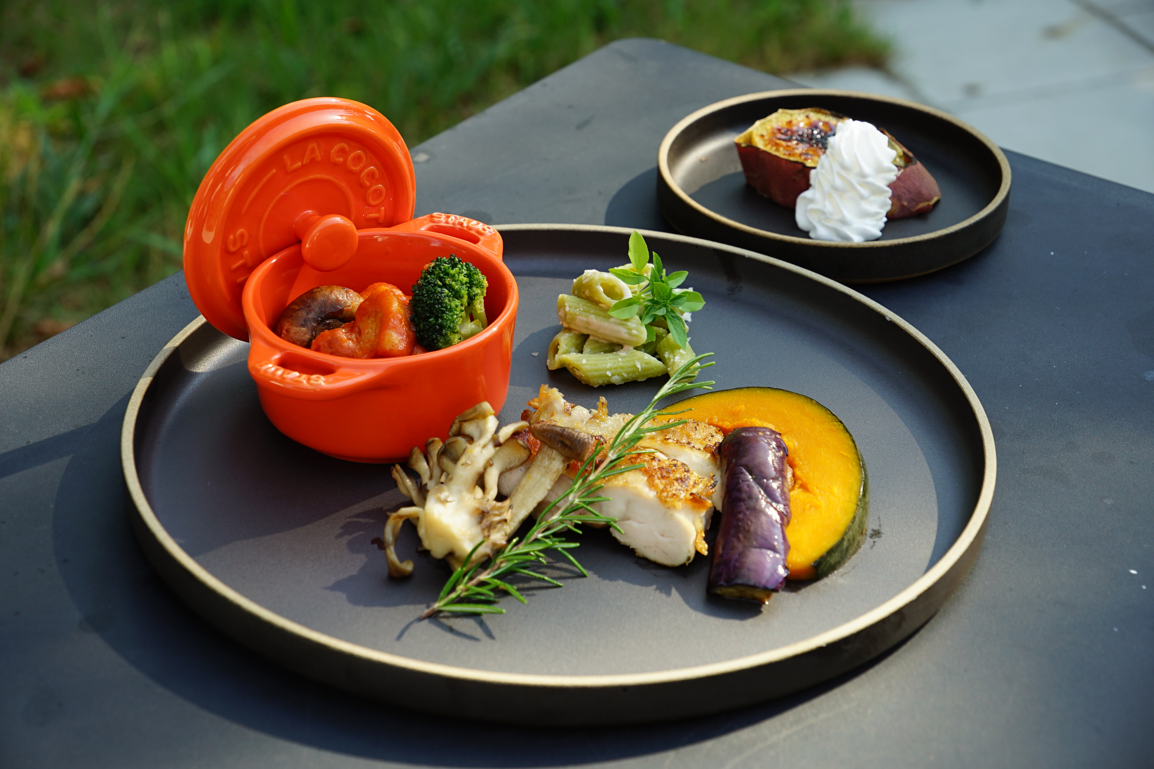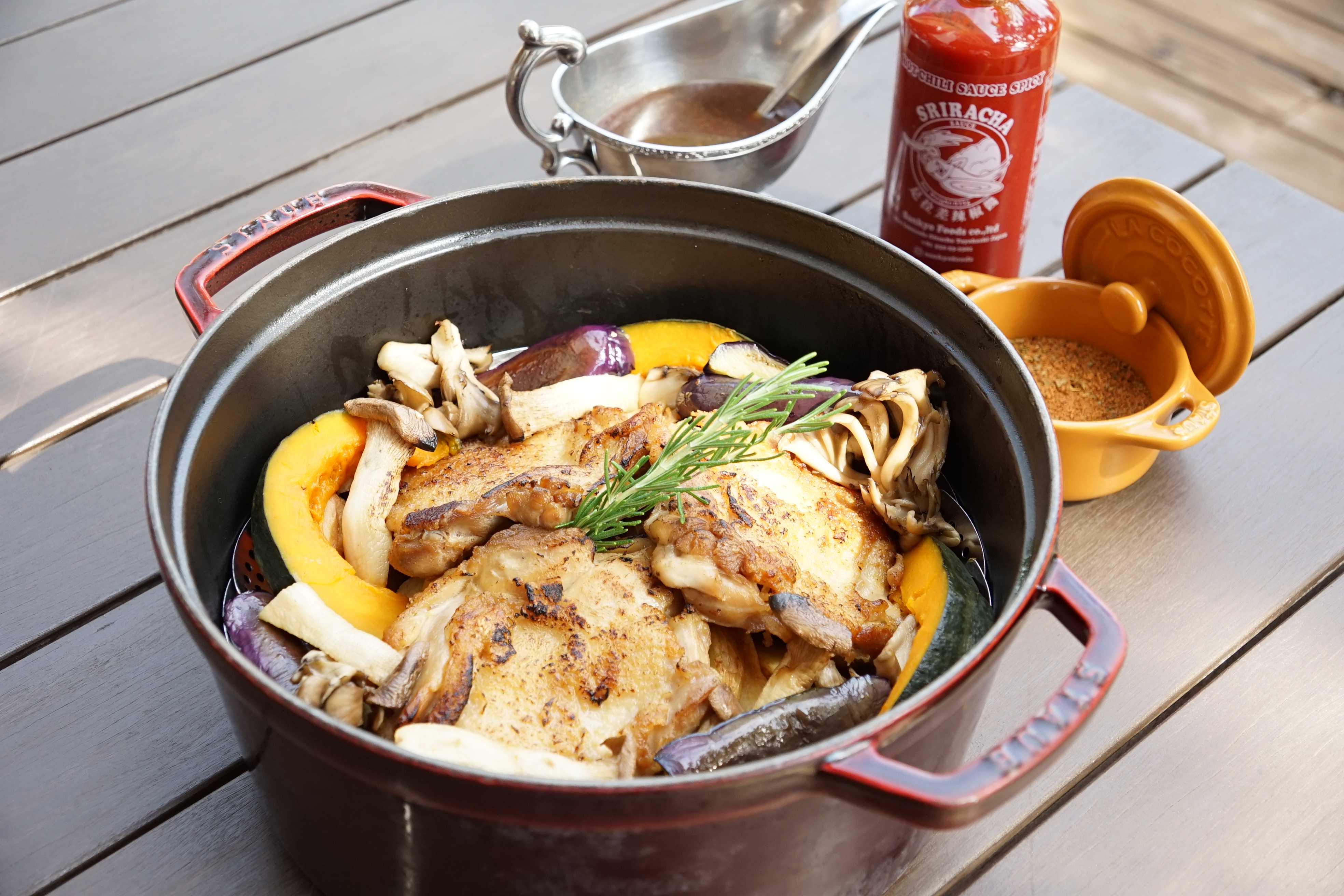皮目をパリッと焼いたチキンは、ケイジャンパウダー・シラチャーソース・シャリアピンソースの3種の味でご用意。付け合わせは、丸ごとオーブン焼きのかぼちゃとマイタケです。