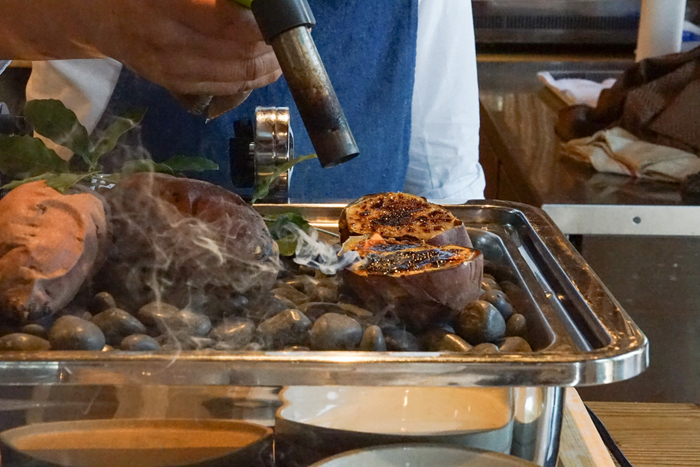 石の上でじっくり焼き上げたサツマイモに、特選カソナード(粗糖)をふりかけ、バーナーで表面を香ばしく焼き上げてブリュレ風に仕上げます。ほくほくとした甘みと、香ばしいカラメルの香りが広がる秋限定スイーツです。