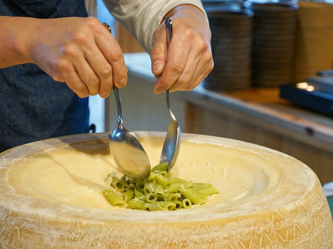 ホールグラナパダーノで仕上げる濃厚なチーズソースに、きのこの王様・ポルチーニを合わせた香り豊かなショートパスタ(ペンネ)です。自家菜園のバジルまたは舞洲産ルッコラをトッピングして仕上げます。