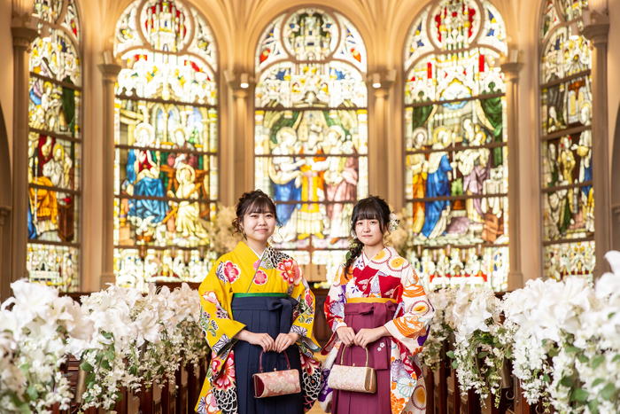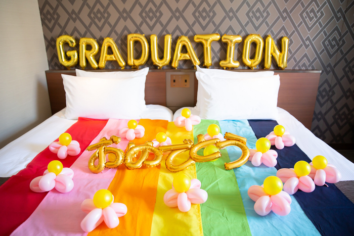 卒業袴のレンタル・着付け・ヘアメイク、ホテルで人気のアフタヌーンティー、卒旅限定宿泊デコレーションルームがセットになった宿泊プラン。ホテル内のフォトジェニックなスポットで撮影も行っていただけます。