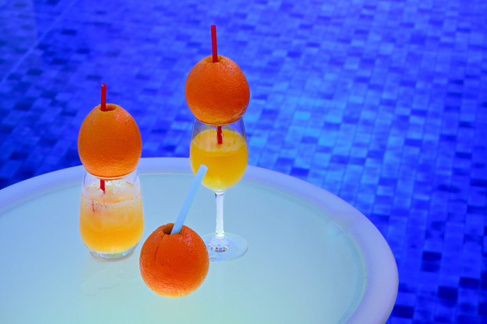 今回は「カジュッタオレンジジュース」「カジュッタスクリュードライバー」「カジュッタミモザ」の3種類のフルーツジュース・カクテルをご用意。ナイトプール(19:00~23:00)の1ドリンクメニューとしても提供しています。最上階のシースループールでは、ナイトプールの時間帯に翌日の天気予報に合わせたライトアップを実施しており、幻想的な空間でフルーツカクテル片手にリゾート気分を満喫できます。また、昨年よりナイトプールではタトゥーの利用制限をなくし、タトゥーフレンドリープールとしても好評を博しています。宿泊者以外の方もナイトプールとバーをご利用いただけます。この夏新登場の“まるごとフルーツカクテル”をアーバンリゾートならではの開放感とスタイリッシュな空間で、五感に響くひとときをお楽しみください。