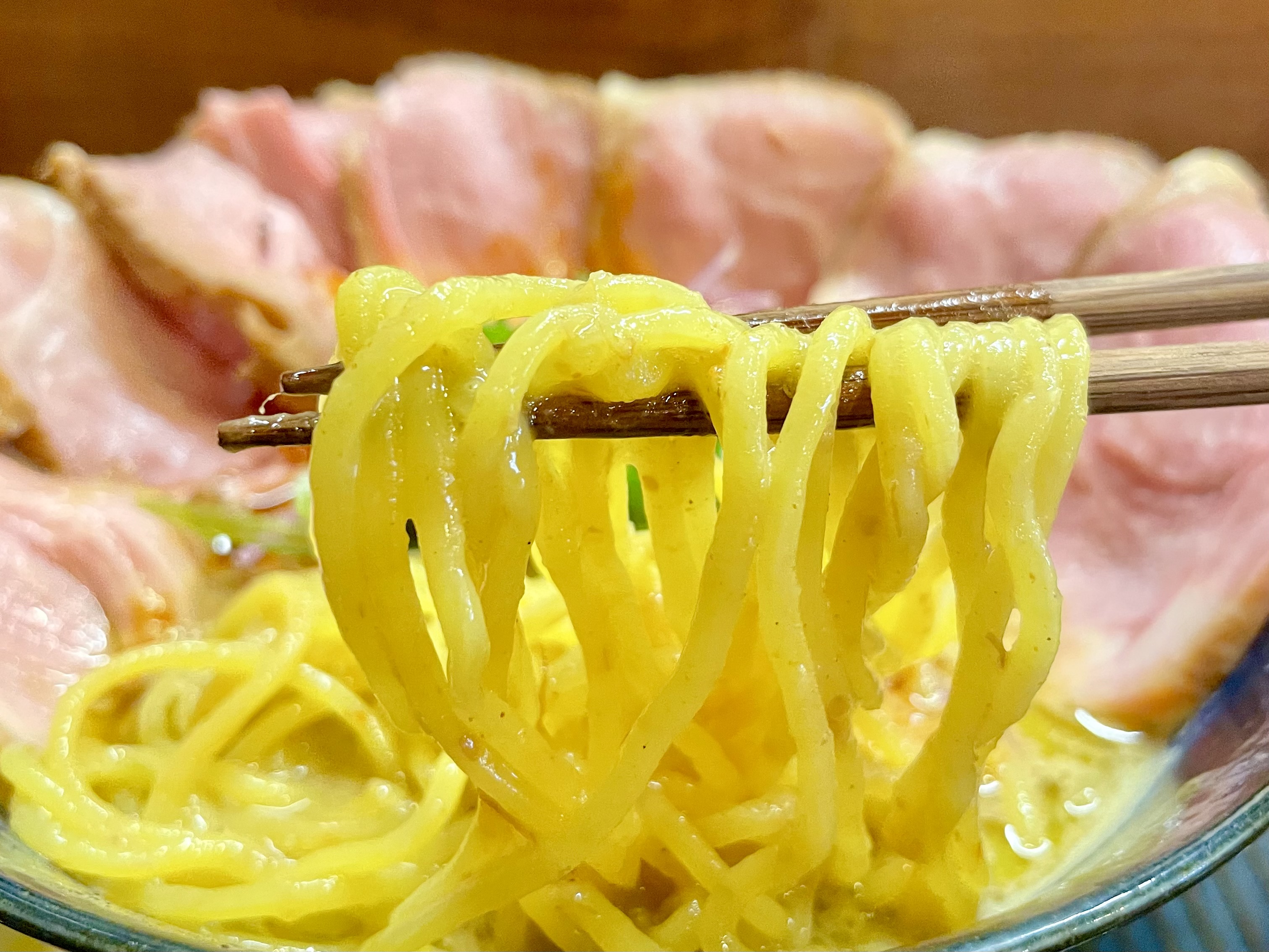 当店の新業態コンセプトの「動きのある一杯」とは「食べてる間ずーっと味変し続ける」ラーメンを指します。特に人気の「CURRY辣々麺ローストポークを添えて」(1,700円)は、食べ始めはカレー味の中太麺、その後混ぜることでCURRY辣々味に徐々に変化。さらに厚みのあるローストポークと共に、さまざまなバリエーションを楽しめます。「おいしい替玉」(300円)はそれだけで美味しい細和え麺ですが、更に丼に投入頂くと最終的に濃厚なカレーラーメンとして最後までお楽しみいただけます。