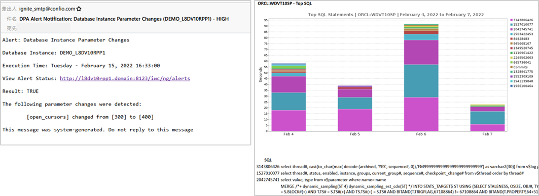 DPAを使い企業内に存在する多様なデータベースを一元管理することで、システム管理者がいる現場では管理工数削減や製品コスト削減、システム管理者がいない現場では稼働状況報告や発生した警告・エラーをメール通知することによるシステム安定稼働の安心感を提供します。