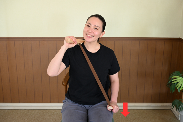 施術者は丸棒に体重を乗せて肩へ圧を加えることで、