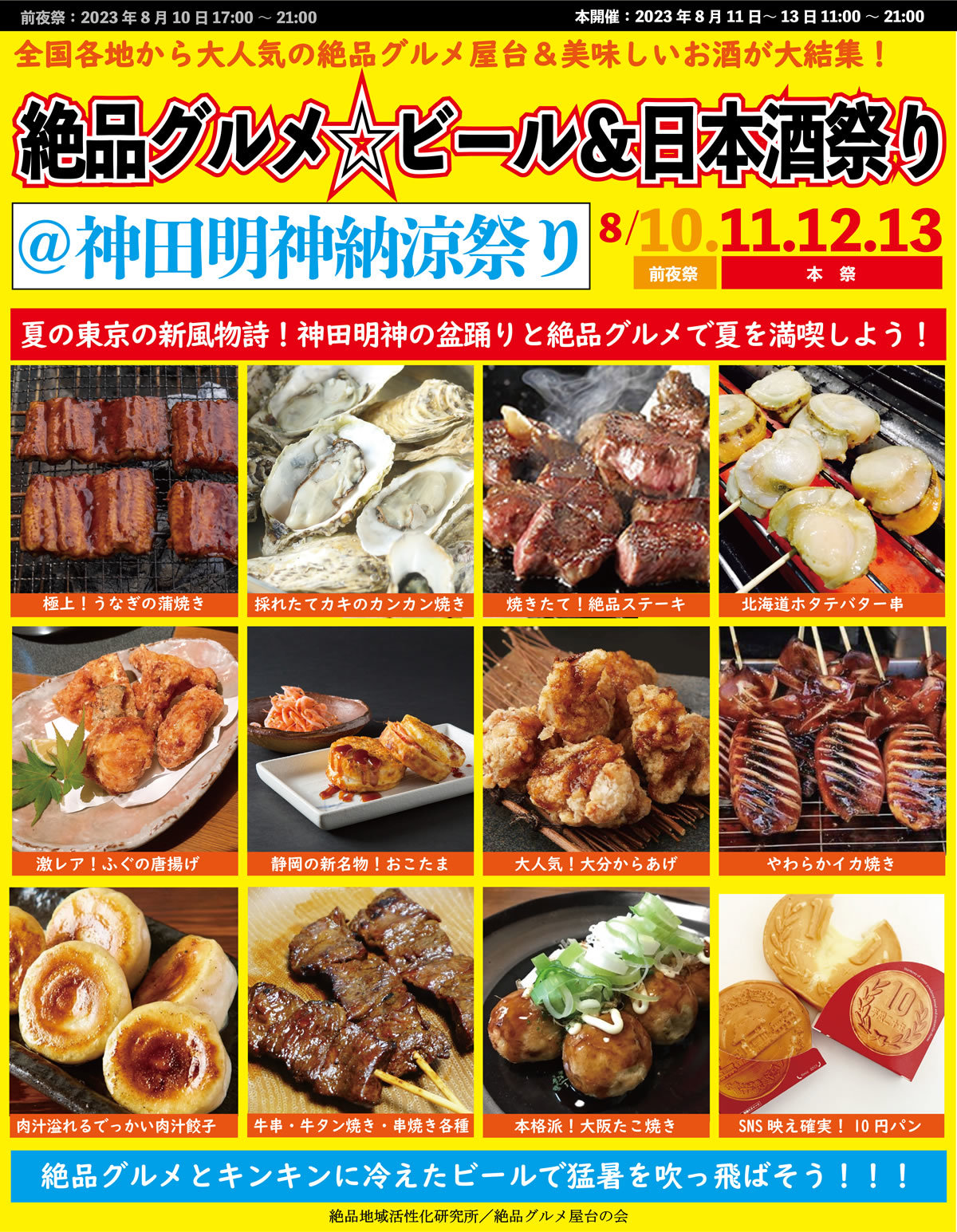 全国の食フェスで活躍する有力店が結集し人気を博す絶品グルメ屋台の会(所在地:埼玉県さいたま市)では、神田明神納涼祭りとコラボして、東京都千代田区に鎮座する神社「神田明神(正式名称 神田神社)」境内にて、2023年8月10日~13日に500円~600円程度を中心価格帯とする“庶民派食フェス”『絶品グルメ☆ビール&日本酒祭り@神田明神納涼祭り』を開催いたします。