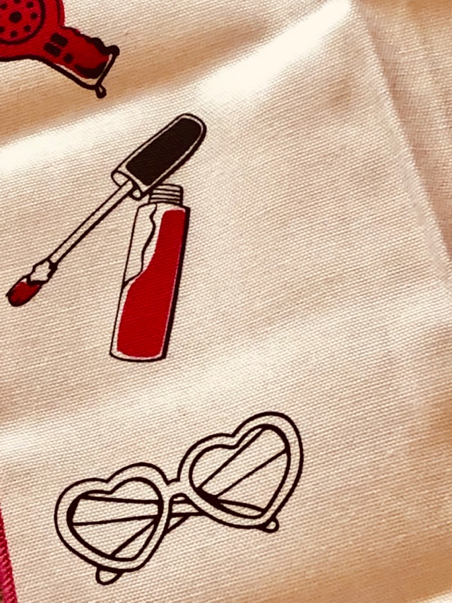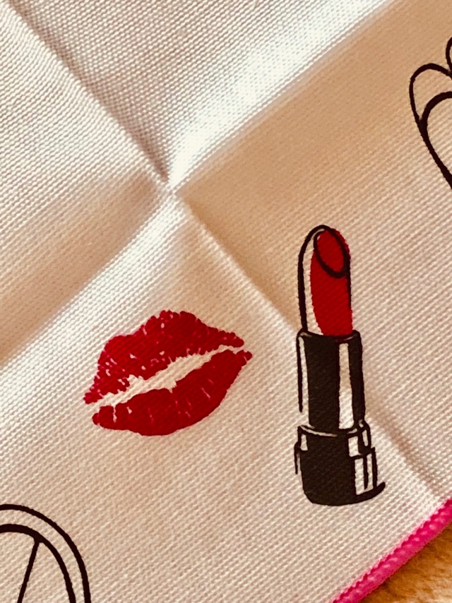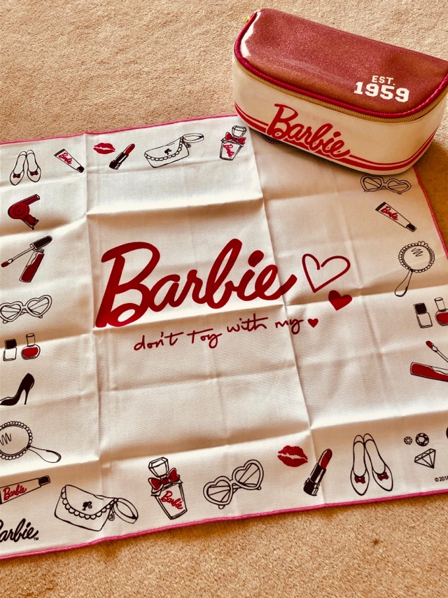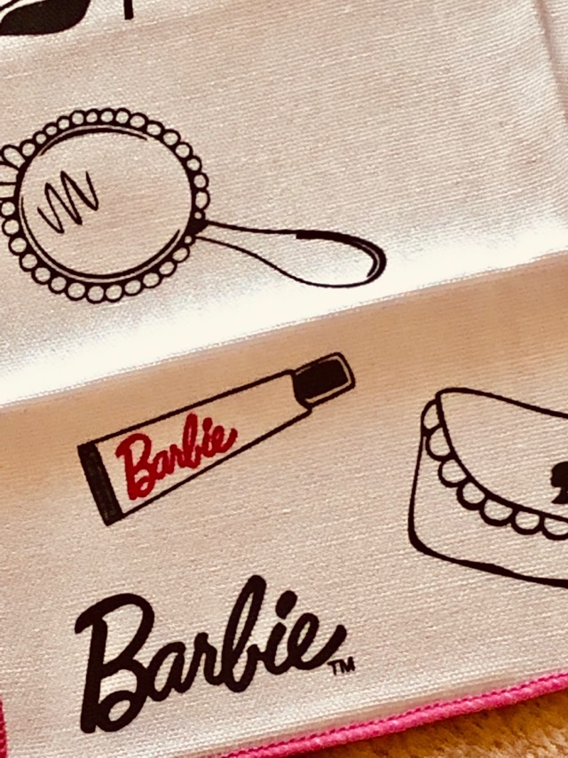実はかわいいメイクアイテムが描かれたこちらのクロスは、バービーのコスメ柄シリーズです。