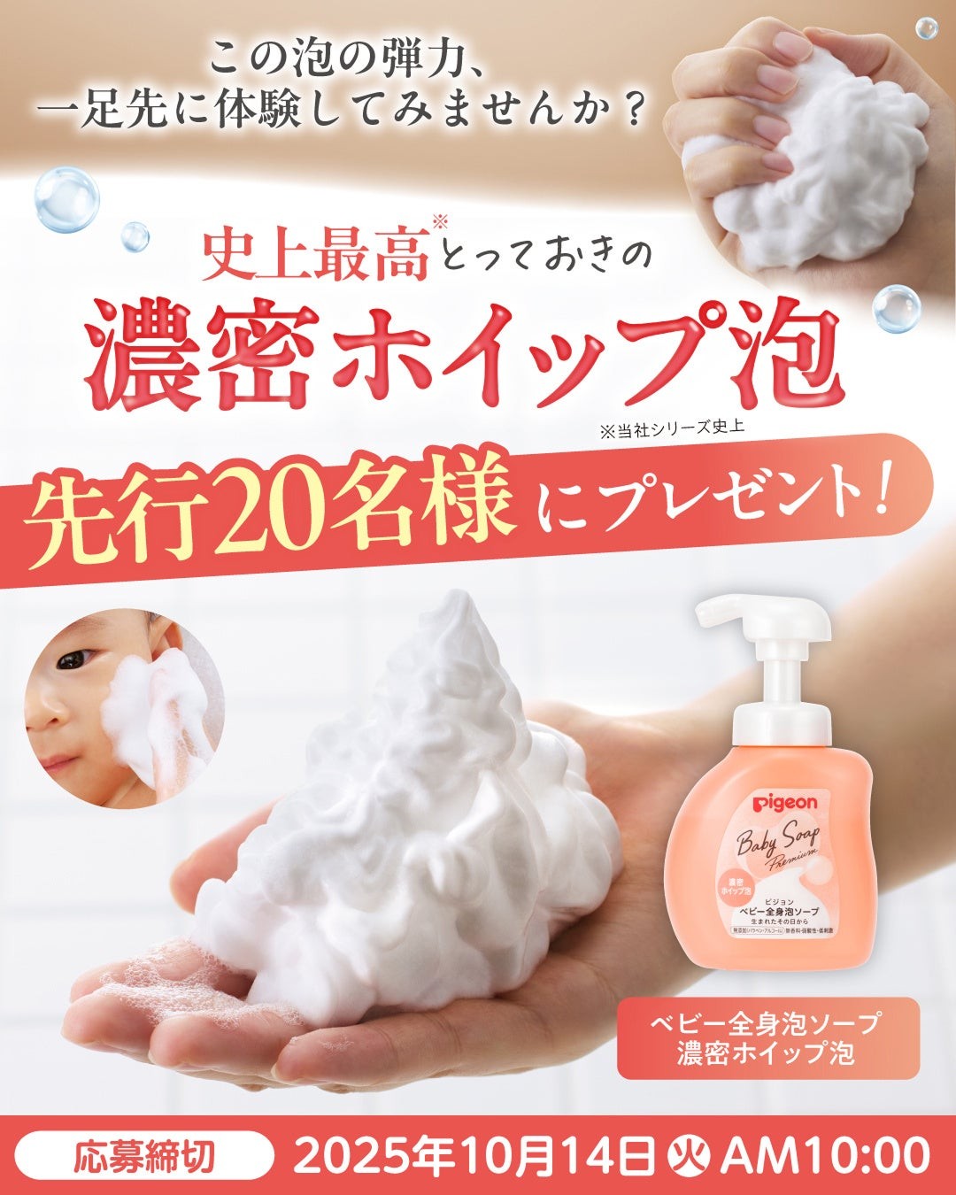 ピジョン株式会社(本社:東京、社長:矢野 亮)は、シリーズ史上最高(※1)の弾力もちもち泡で、保湿成分「セラミド」を2倍(※2)配合した、赤ちゃんの肌に負担を与えずやさしく洗える「ベビー全身泡ソープ 濃密ホイップ泡」を、2025年10月27日(月)より全国のベビー用品専門店・ドラッグストア、当社公式オンラインショップにて販売します。また、発売を記念し、抽選で20名様に本商品が当たるキャンペーンを開催いたします。