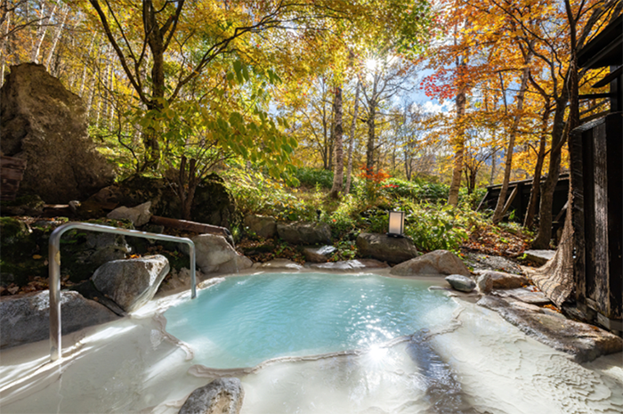 白骨温泉は、乳白色の湯で見た目は青白い色をしています。【小梨の湯 笹屋】の露天風呂では、石灰成分が長い年月をかけて湯船の周りに白い淵模様を作り出しており、その奥に広がる白樺林とのコントラストが素晴らしい。午後になると、奥のほうから日が差し込み、白樺の紅葉が美しく輝きます。