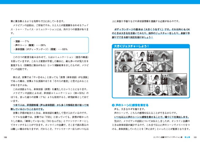 働き方が変わってきた今、会議もオンラインに変わった会社も多くあると思います。また、研修やイベントなどもオンラインで行うケースも増えてきました。本書では、オンライン会議を行う際の大切なことも伝えています。オンライン会議ならではの「ファシリテーターの心配り」をはじめ、「ツールの選び方」「画面うつりをよくするコツ」など。特に、意思の疎通が難しいオンライン会議での伝え方なども。