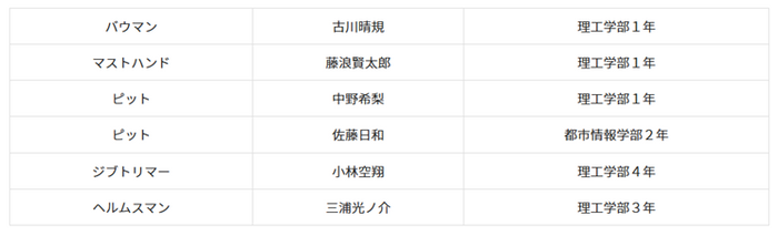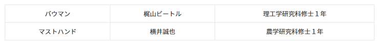 メンバーで唯一の4年生の小林空翔選手(理工学部)は「チーム内で昨年のレースを知るのは私だけで、上級生としてチームを支えながら一つひとつのプレーに責任を持ち、全力で目標達成に挑みます」ときっぱり。三浦光ノ介選手(理工学部3年)も「この4カ月間で叩き込んだマッチレースの知識が僕たちの武器です。過去最高のチームワークを構築できた自負があり、6人の力を結集し、全力で優勝を目指します!」と力を込めました。