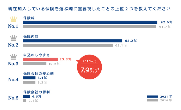 ご加⼊者さまを対象に実施したアンケート(※4)では「現在加⼊している保険を選ぶ際に最重要視したこと」が表2の通りの結果となりました。特に「申込のしやすさ」は2016年9⽉に実施したアンケート(※5)と⽐較し、約7.9ポイントアップと、より多くのお客さまにインターネット申込の利便性をご体感いただいております。