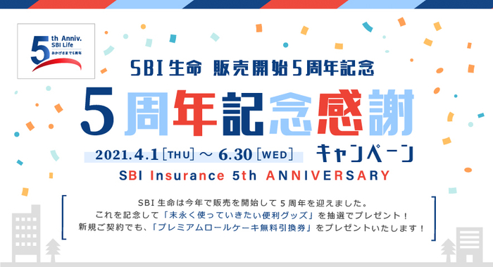 SBI⽣命保険株式会社(本社:東京都港区、代表取締役社⻑:⼩野尚、以下「SBI⽣命」)は、販売開始から5周年を迎えるに際して、⽇頃のご愛顧に感謝し、2021年4⽉1⽇(⽊)より「5周年記念感謝キャンペーン」を実施いたします。