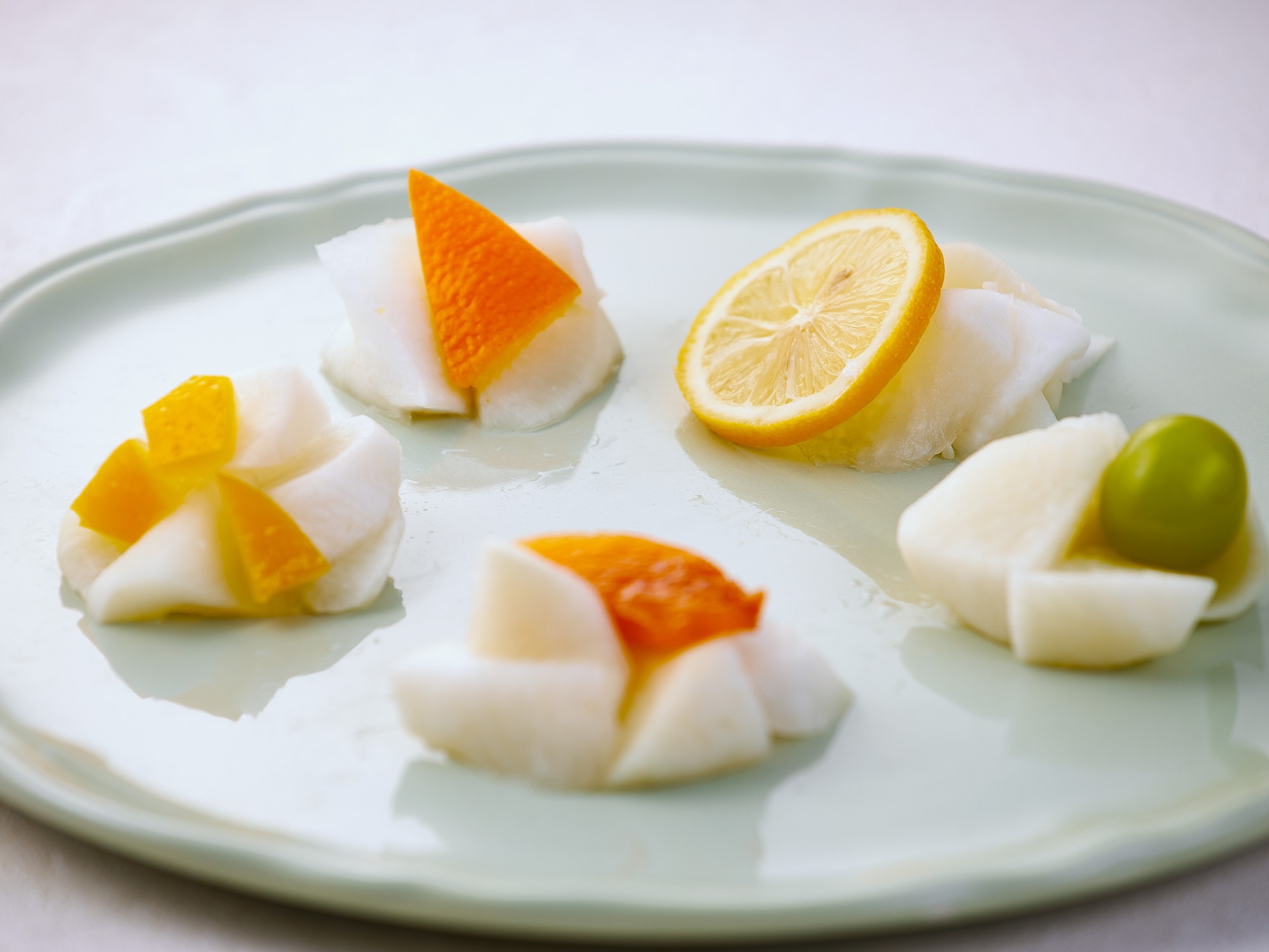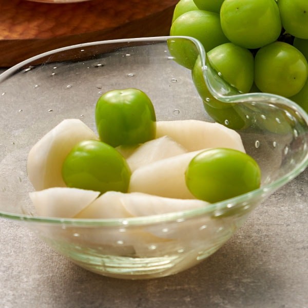 大根は皮を残して手切りすることでパリッと心地よい食感を残しつつ、丁寧な下漬けで、かぶのような滑らかな舌触りもあわせ持っています。それぞれのフルーツの特徴を生かすような漬け床を用い丁寧に漬け込むことで、二つの異なる素材の美味しいハーモニーが生まれます。