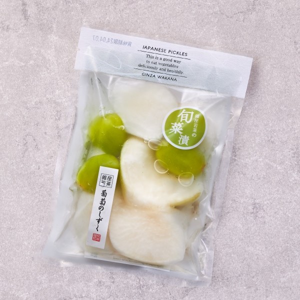 銀座若菜の看板商品であるフルーツ大根シリーズは、季節の移ろいをお漬物で楽しんでいただけるようにと開発されたこだわりの商品です。旬のフルーツと皮付き大根の甘酢漬は、意外ながらも絶妙なバランスの味わいに。