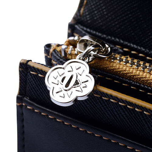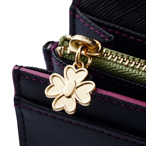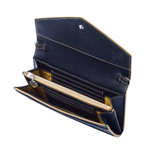 高級感あるブラックの角シボ調型押し生地をベースに、イメージカラーをプラス。表面の留め具は着物の模様と、ファスナーの金具には竹の口枷をデザインしました。