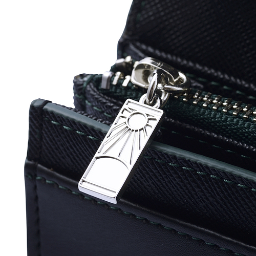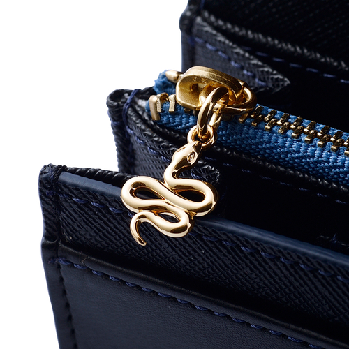 高級感あるブラックの角シボ調型押し生地をベースに、イメージカラーをプラス。表面の留め具は隊服ボタン、ファスナーの金具には蛇をデザインしました。