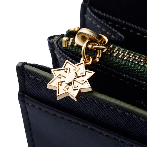 高級感あるブラックの角シボ調型押し生地をベースに、イメージカラーをプラス。表面の留め具は隊服ボタン、ファスナーの金具には炭治郎の耳飾りをデザインしました。
