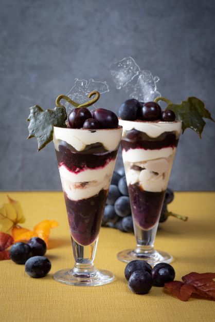 秋の味覚先取りの粒が輝く新作カフェメニュー“巨峰パフェ”