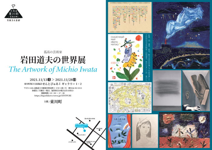 このたび、北海道出身の芸術家岩田道夫氏の作品展を開催するにあたり、多くの皆様のご支援とご協力をいただき、東川町複合交流施設せんとぴゅあⅠギャラリーにて作品展を開催する運びとなりました。絵画や詩、童話、彫刻、けしごむハンコ等多様な作品を制作された岩田道夫さんは2014年心破裂のため帰らぬ人となりましたが、今なお多くの方の心に生き続けております。今回は初期から晩年まで多くの作品の中から、不世出の作品をご覧いただきます。皆さまのご来場をお待ちしております。