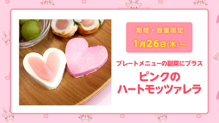 白いモッツァレラにはスライスした岩下の新生姜で表現した「岩下の新生姜ハート」を添えました。ピンクと白、2色のハートモッツァレラを1月26日(木)から期間限定で、プレートメニューの副菜として提供いたします。