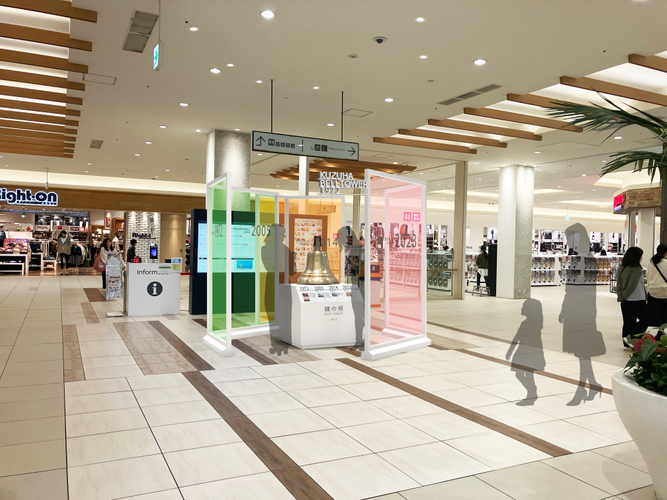 KUZUHA MALLは1972年に「京阪くずはモール街」としてオープンし、初代くずはモール街のシンボルだったのが「鐘の塔」。現在は毎日12時、15時、18時の3回、時報として、季節ごとに変化を加えながら館内に鐘の音を流しているほか、 鐘の実物も本館ミドリノモール1Fに展示しています。