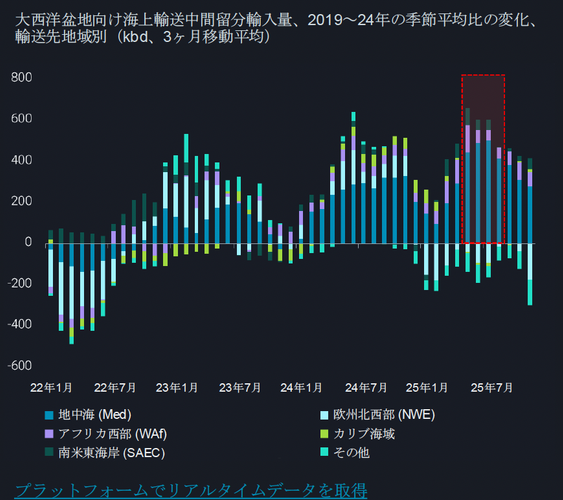 特に、ロシアの主要石油企業であるルクオイルおよびロスネフチに対する米国・EUの制裁が、荷揚げ遅延や航路の長期化を招き、海上滞留量を押し上げました。