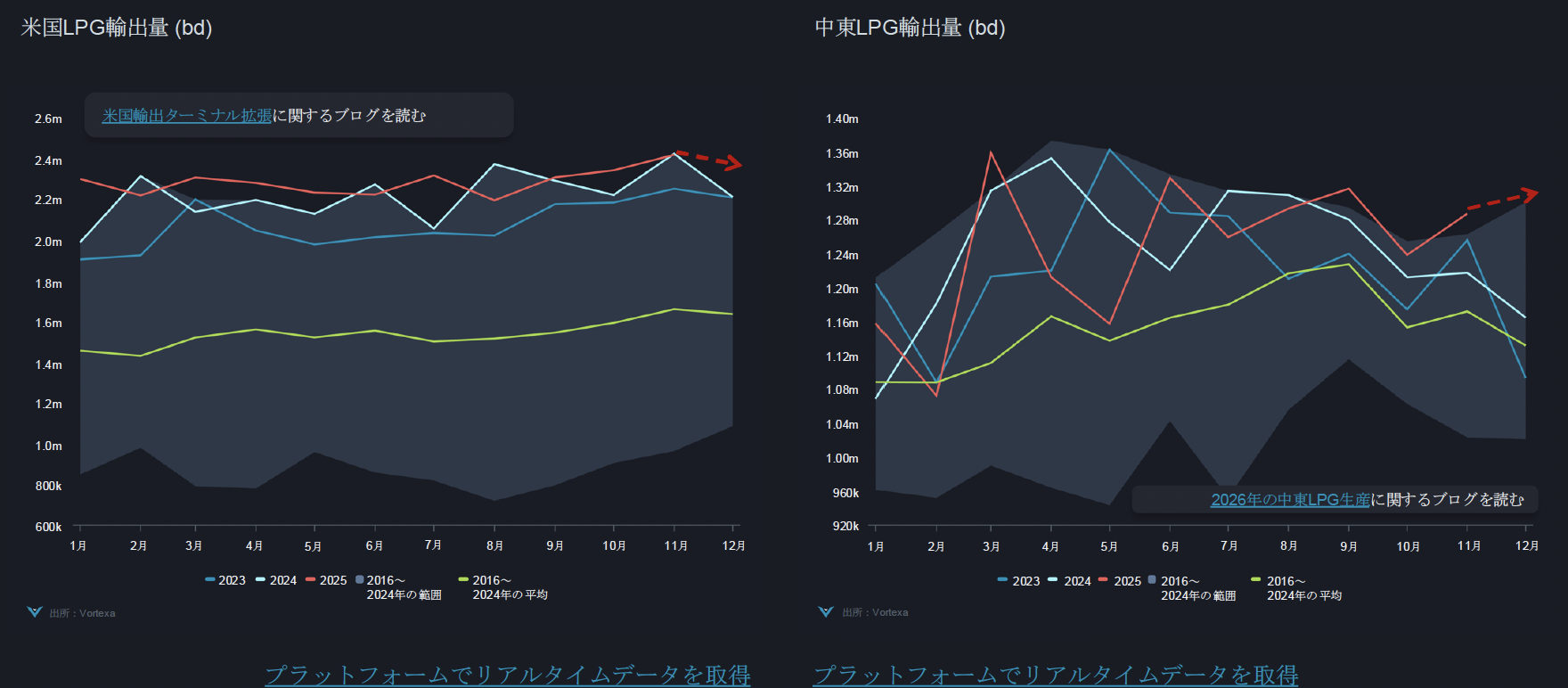 供給増加と新規ターミナル拡張を背景に、2026年には米国と中東によるLPG輸出の競争激化が見込まれています。