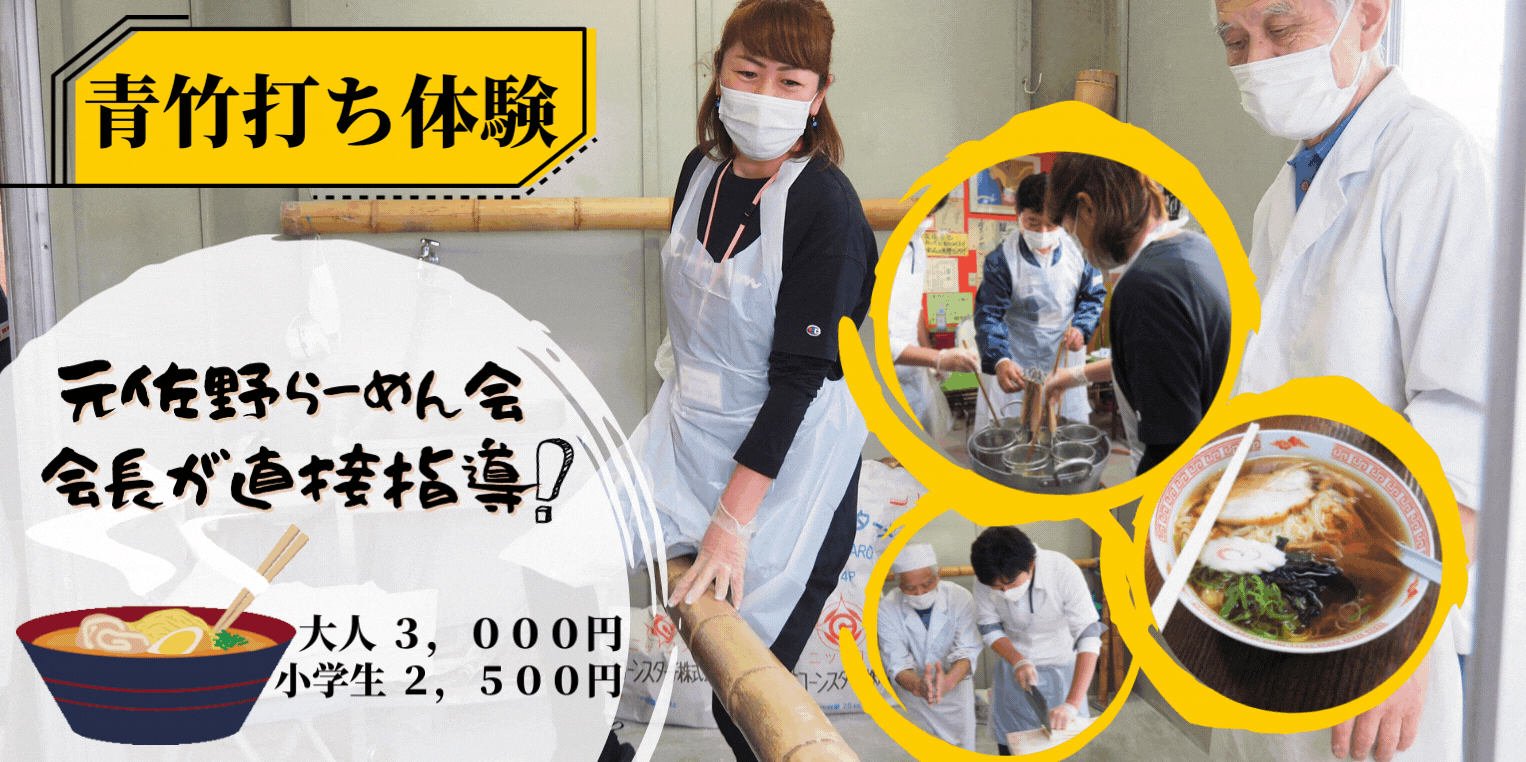 そんな「青竹打ち」を元佐野らーめん会会長が直接指導する体験プランがただ今好評受付中です。体験メニューとしては、青竹で生地を薄く伸ばし、専用の包丁で麺切りし、自身で作った麵を召し上がることができます。また、体験会場となる「佐野やつや」の店主が作る麺(一玉)を人数分お土産用としてお持ち帰りいただけるプランとなっています。