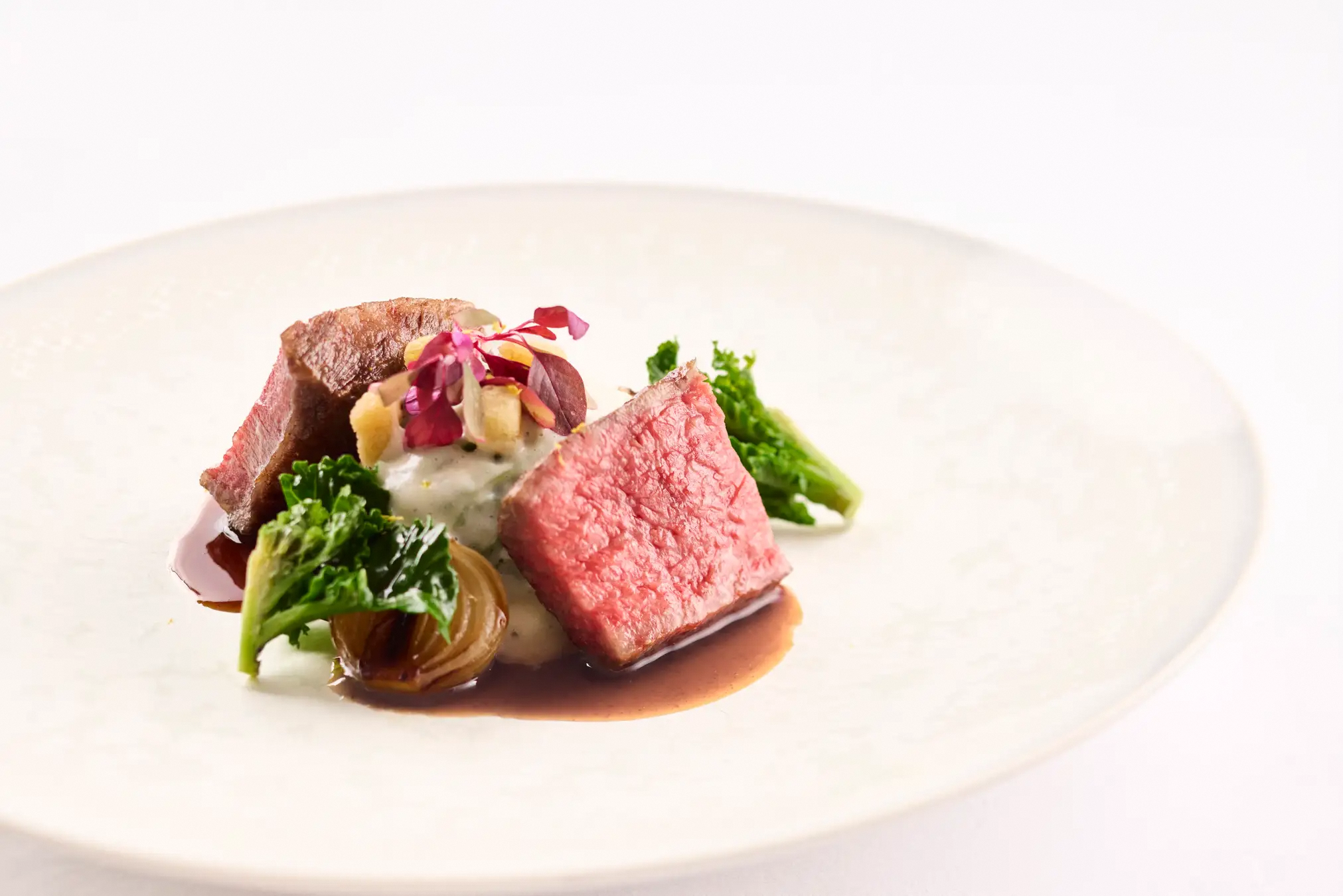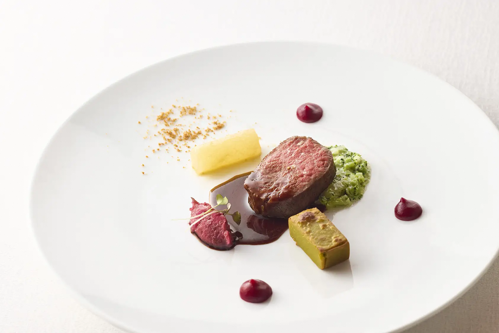 メニュー:鳥取和牛オレイン55フィレ肉のロティ 鳥取県産大山ブロッコリーのコンポテ ソース・ポワブラード