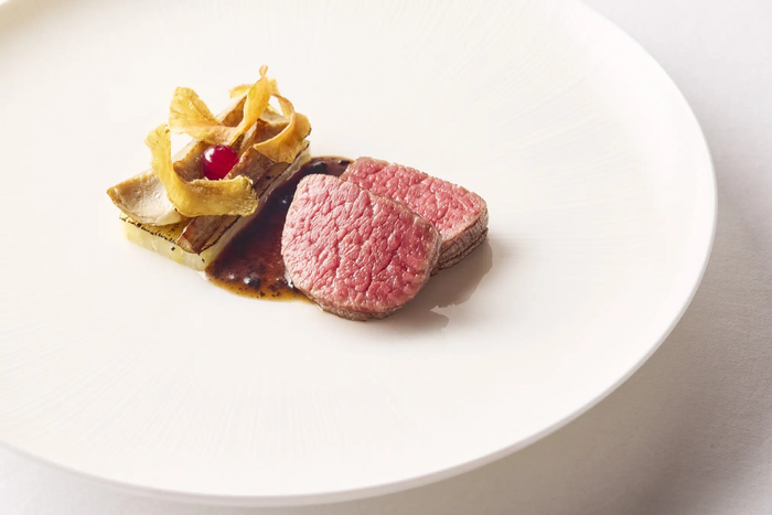メニュー:鳥取和牛イチボのロティ 牛テールとジャガイモ コンテのドフィノワ 縮緬キャベツのエチュベ シェリー風味のソース・コニャック