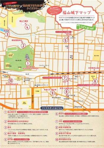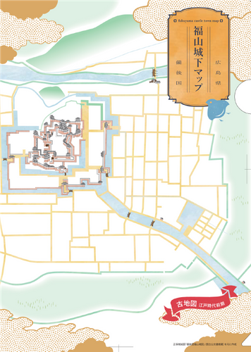 広島県福山市では,福山城下マップ(クリアファイル)を購入し,城下町の古地図のファイルと現在の地図が印刷されているちらしを重ね合わせてクイズスポットのクイズを解きながら城下町をめぐるクイズラリーを実施します。