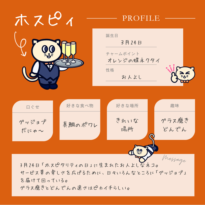飲食・接客業の仕事には欠かせない「ホスピタリティ」が由来のお人よしなネコ。