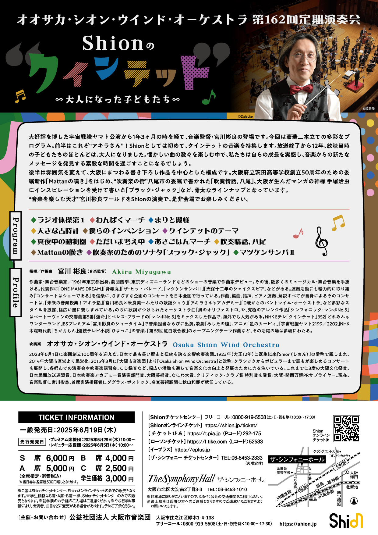 プログラム全曲発表!NHK『クインテット』の音楽を特集!音楽監督・宮川彬良とともにお届けする、Shion「第162回定期演奏会」