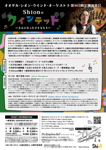日本で最も長い歴史と伝統を誇る交響吹奏楽団の Osaka Shion Wind Orchestra を有する公益社団法人大阪市音楽団(本社:大阪市住之江区/理事長:石井徹哉)は、指揮に音楽監督・宮川彬良を迎え開催する2025年9月20日(土)に開催の「第162回定期演奏会」のプログラムを全曲発表いたしました。