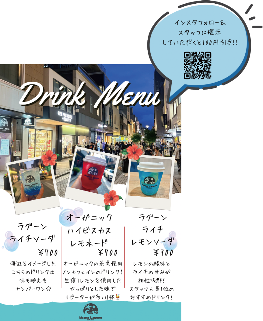 MoanaLagoon公式Instagramをフォローのうえ、当日スタッフに画面をご提示いただくと、お会計から100円引きとなります。