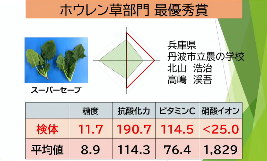 担当した受講生の一人、髙嶋渓吾(たかしま けいご)さんは、「受賞できてまず素直に嬉しいし、びっくりしています。同じホウレンソウでもうまくいかなかった圃場もあり、土質や細かい管理の仕方など、卒業後もまだまだ勉強を続けていきたいと感じます。」との感想を述べていました。