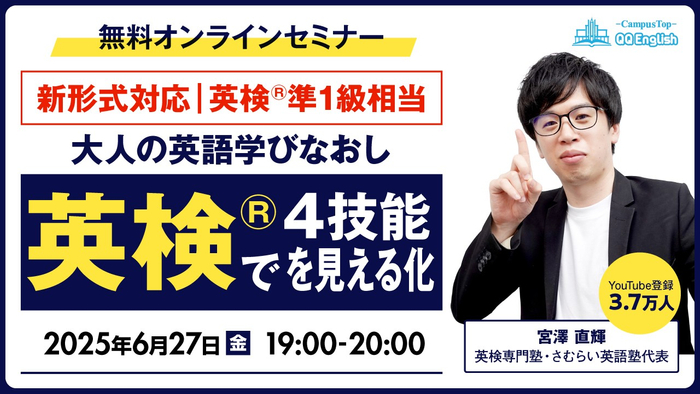 株式会社QQEnglish(本社:東京都渋谷区、代表取締役:藤岡頼光、以下QQEnglish)は、2025年6月27日(金)19時から英検専門塾・さむらい英語塾代表の宮澤直輝さんをお招きして、「大人の英語学びなおし!英検®︎で4技能を見える化」と題した無料オンラインセミナーを実施することをお知らせいたします。