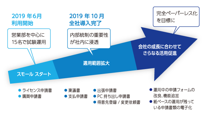 「当社では従来、紙の申請書・稟議書フォーマットを使って申請業務を行っていました。さらに、一部の申請・承認処理はメールやSNS、口頭で行われており、承認プロセスが明確でなく記録も残らないなど、内部統制の面で懸念もありました。新規株式上場(IPO)を目指す当社としては、これらの課題を解決して内部統制強化を図ることが急務でした」