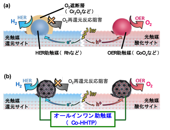 光触媒OWS助触媒に関する上述の困難に対する解決策の1つは、オールインワン助触媒の確立です(図2(b))。オールインワン助触媒とは、単一の助触媒(または単一の前駆体から生じる助触媒)が、HERとOERの両方を触媒するが、酸素還元逆反応を促進しないものを指します。これまでに助触媒は、実質的には金属および金属酸化物に限定されており(HER助触媒:Rh/Cr<sub>2</sub>O<sub>3</sub>など、OER助触媒:CoOOHなど)、オールインワン助触媒は実現されていませんでした。