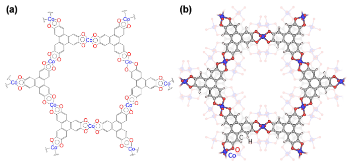 東北大学大学院理学研究科の坂本良太教授の研究グループは、京都大学大学院工学研究科のJingyan Guan大学院生、鈴木肇助教、冨田修助教、阿部竜教授、大阪大学大学院基礎工学研究科の神谷和秀准教授、原田隆史技術専門職員、大阪大学大学院工学研究科の佐伯昭紀教授、東北大学の黒河博文講師、海原大輔技術職員、米倉功治教授(理化学研究所グループディレクターを兼任)、東京理科大学の福居直哉研究員(研究当時)、前田啓明講師(研究当時)、山口友一講師、工藤昭彦教授、近畿大学の杉本邦久教授、岡山大学の山方啓教授らとの共同研究により、導電性を有する二次元金属有機構造体(2D-MOF)の一種、Co-HHTP(図3)がオールインワンの助触媒として機能することを発見しました。複雑な多段階工程ではなく、ワンステップ自己組織化法によって、光触媒(SrTiO<sub>3</sub>:Al)の表面をCo-HHTPのナノドメインで修飾することに成功しました(図4)。Co-HHTPを修飾したSrTiO<sub>3</sub>:AlはO2遮断層なしで酸素還元逆反応を起こさず、350nmにおける見かけの量子効率が31.5%という安定したOWSを実現しました(図5)。