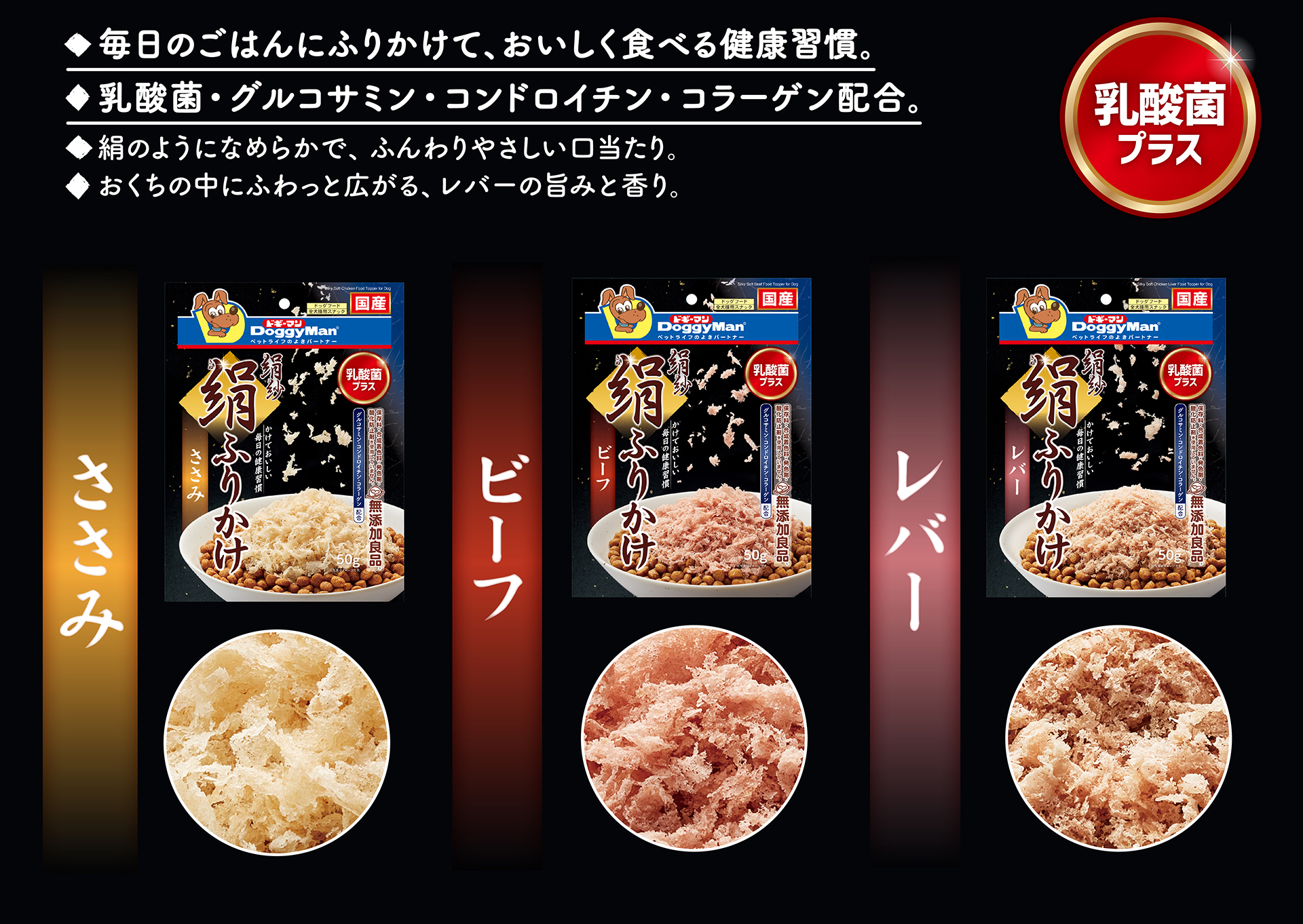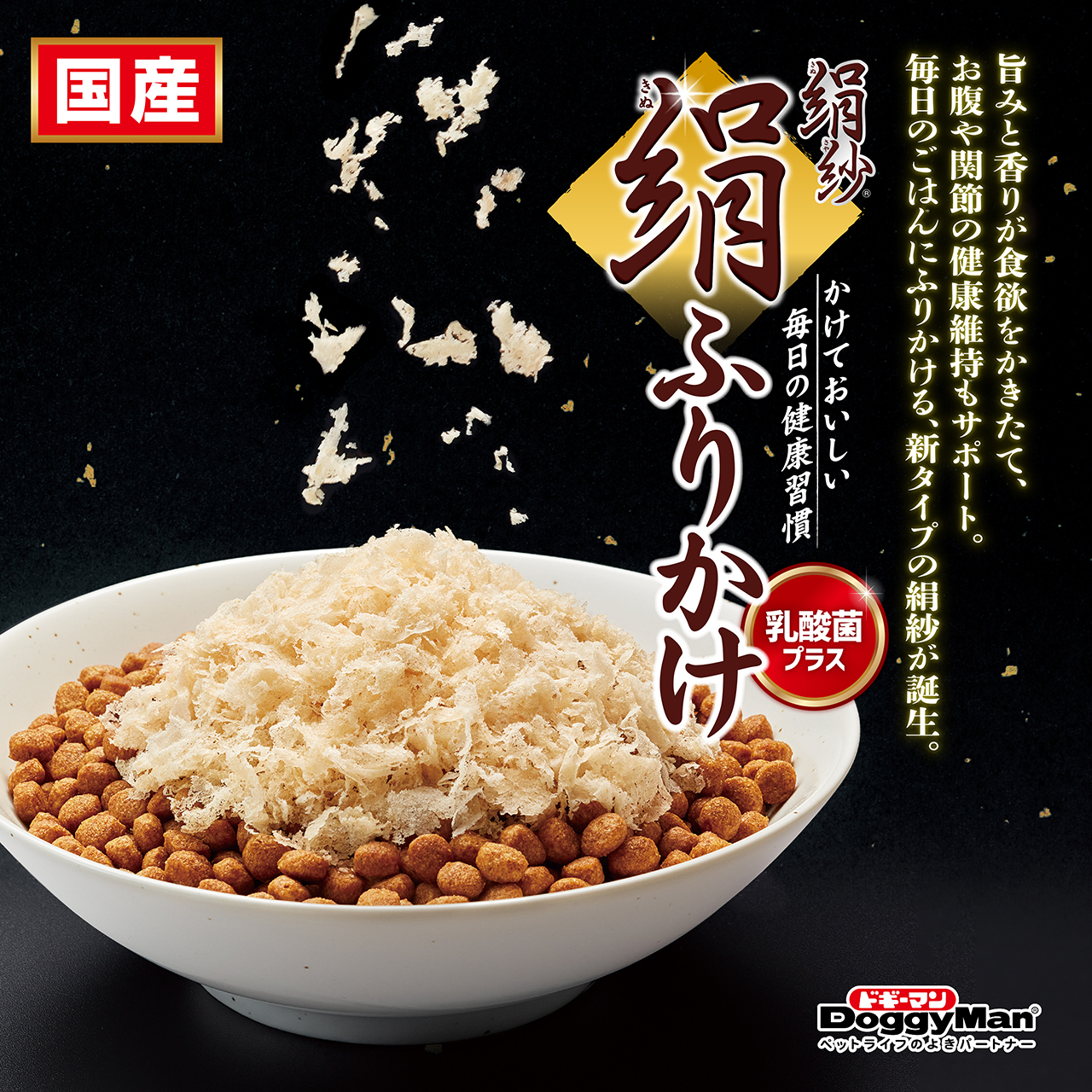 ペットフードはドギーマン♪犬用人気シリーズ「絹紗」に お腹や関節の健康維持をサポート・ふりかける新タイプの 『絹ふりかけ』が3月21日登場!