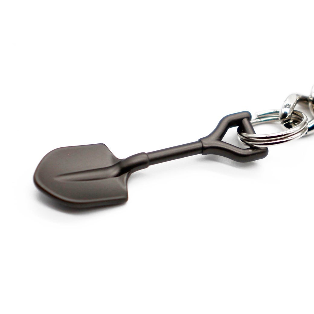 付属の **スコップ型フィギュア** や **ロゴプレート** など、随所に遊び心をプラス。キーチェーンとして使用すると、各パーツが触れ合い **金属音が鳴り響き、まるで“熊よけの鈴”のような存在感** を発揮します。
