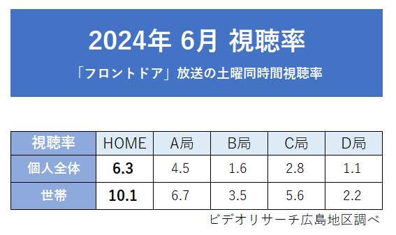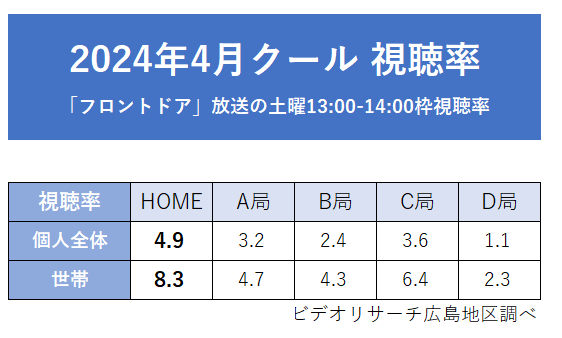 広島ホームテレビ「フロントドア」2024年度4月クール・6月月間視聴率 同時間帯1位を獲得! 【フロントドア】2024年度4月クール・6月月間視聴率<個人全体・世帯>いずれも1位 広島ホームテレビ 2024-07-02 10:00 広島ホームテレビ(本社:広島市中区)で毎週土曜ごご1時から放送、ひろしま深掘りライブ「フロントドア」は、2024年度4月クール・6月の月間平均視聴率で個人全体・世帯いずれも同時間帯1位(ビデオリサーチ調べ、広島地区)を記録しました。 これからも、今まで以上に広島の土曜お昼に定着する番組を目標に独自の着眼点・親しみやすさを持つロザンのお二人と共に広島の出来事を楽しく、そして真剣に切り込んでいきます。 【出演者】 宇治原史規・菅広文(ロザン)、廣瀬隼也・岡本愛衣 (HOMEアナウンサー)ほか 番組公式HPはこちら! ジャンル: エンタメ スポーツ ライフスタイル タグ: carp HOME カープ フロントドア ロザン 宇治原史規 岡本愛衣 広島ホームテレビ 廣瀬隼也 菅広文 画像一覧 一括ダウンロード