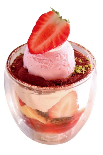 当店のイチゴスイーツはどれもボリューム満点なため、少しだけイチゴデザートを楽しみたい方用にミニパフェをご用意しました。ミニといえど、イチゴソースやミルクゼリー、カスタード、パンケーキなど、さまざまな美味しさがぎゅっと詰まっており、十分にご満足いただけます。バレンタイン限定のチョコクランチが、今だけの特別な味わいを演出します。