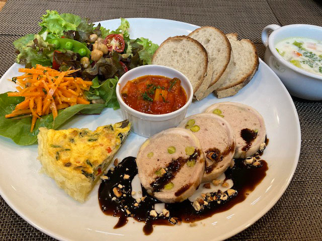 絵本に登場するワンプレート料理に盛り付けられているガランティーヌを現存するレシピノートから、ローズチキンを使用して再現しました。