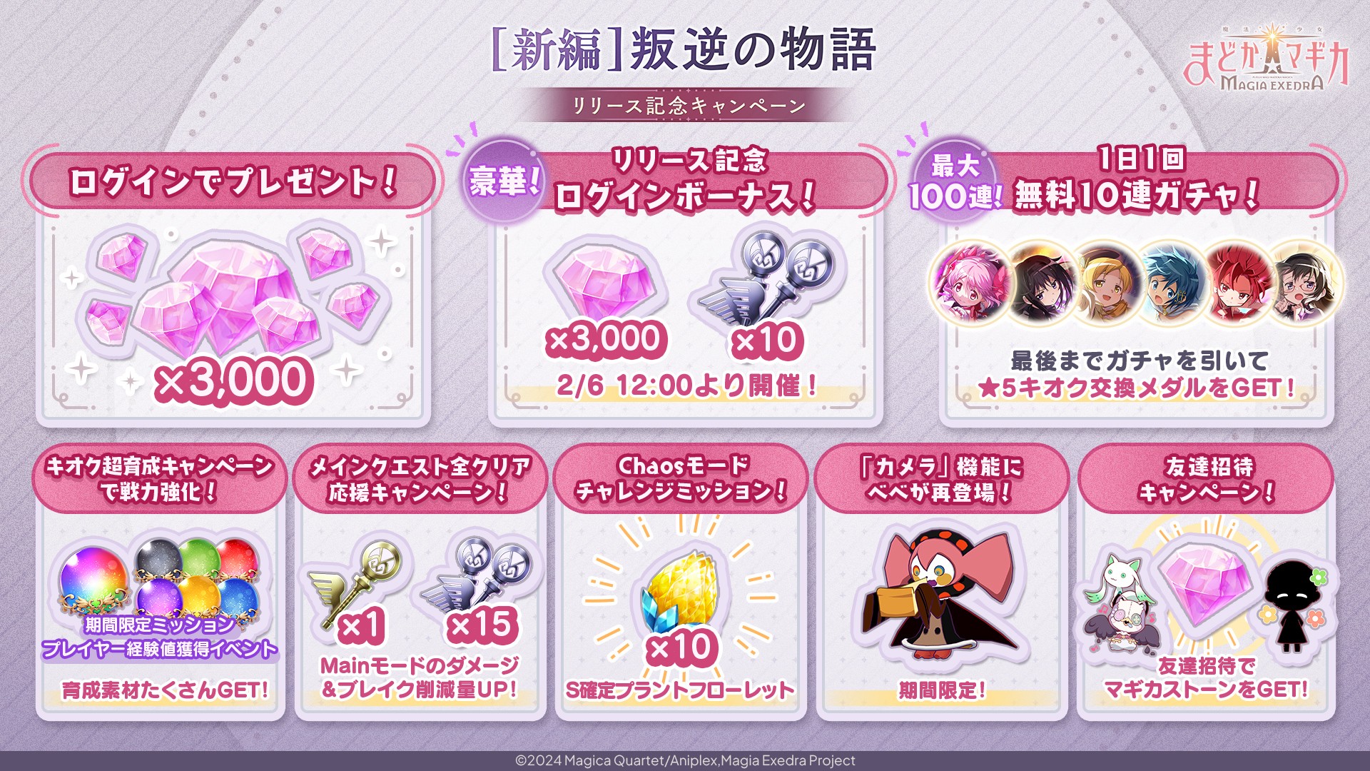 2026年1月30日(金)12時より、[新編]叛逆の物語のリリースを記念し、様々なキャンペーンを開催いたします。初回ログインだけでマギカストーン3,000個がもらえるなど、豪華な内容盛りだくさんとなっております。