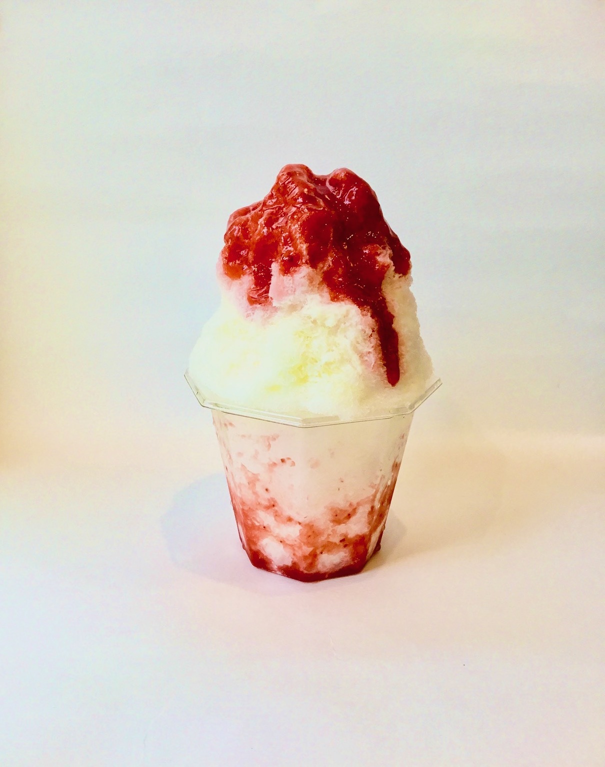 福岡県産のあまおういちごを使用したイチゴソースとミルクソースがかかった「おいしい氷屋」人気No.1の商品です。